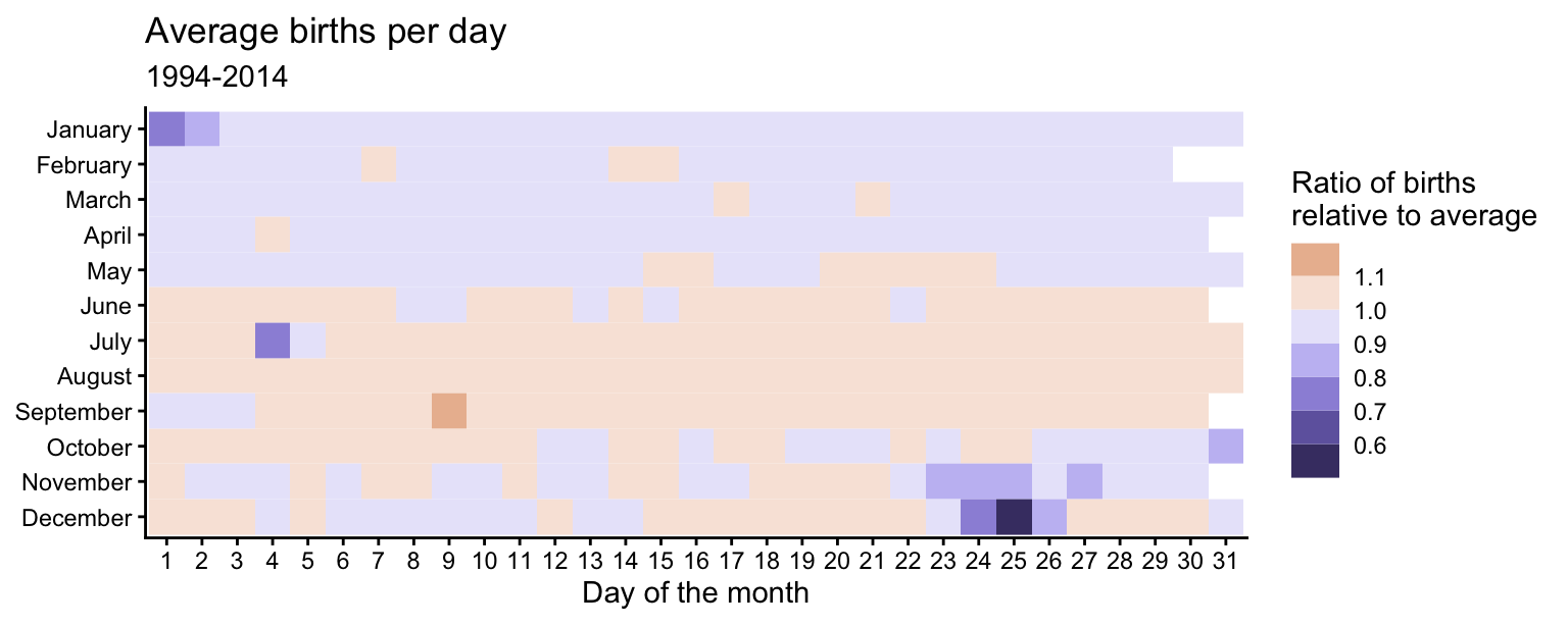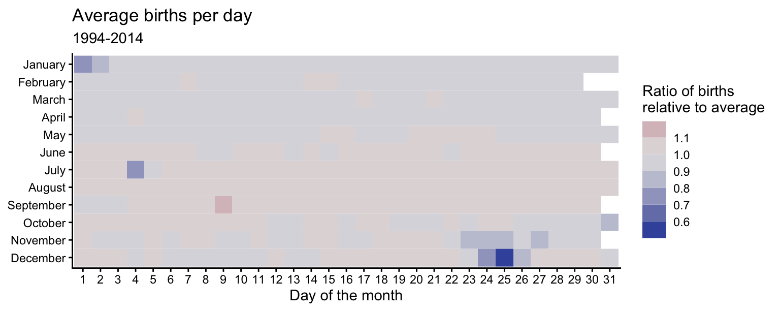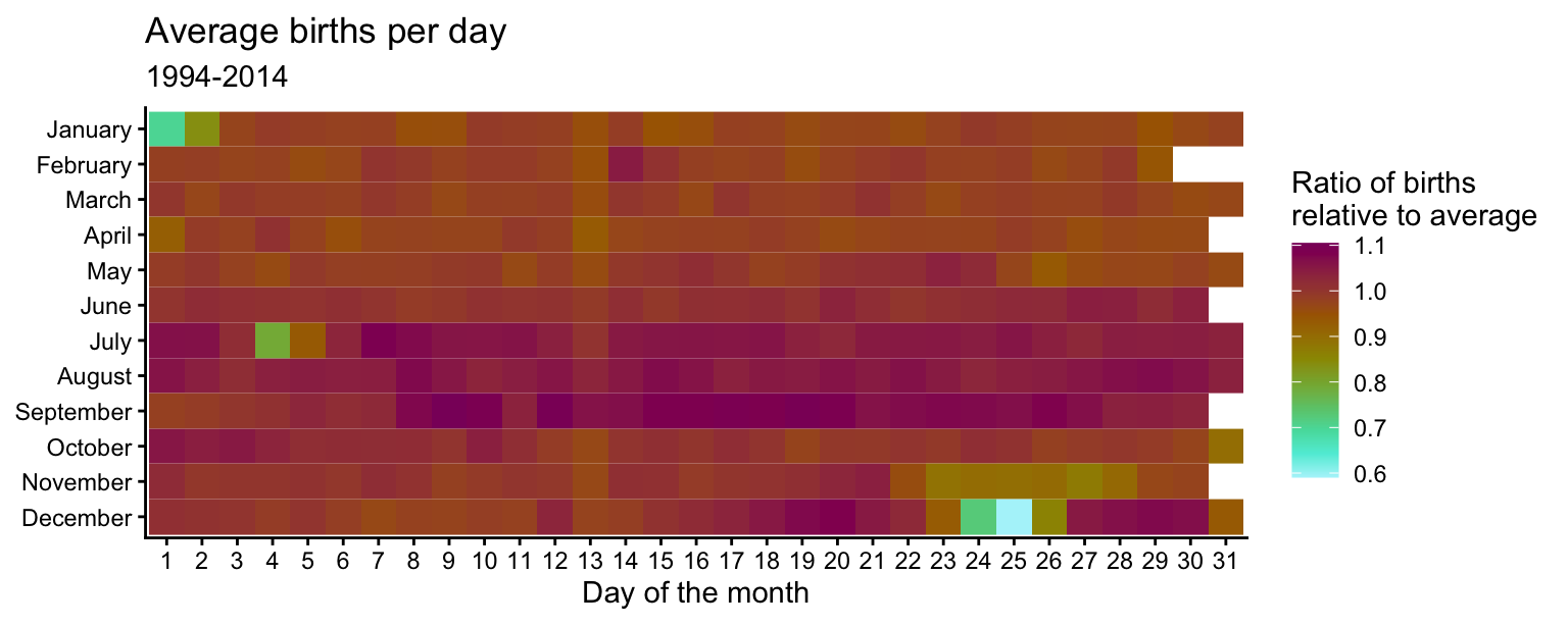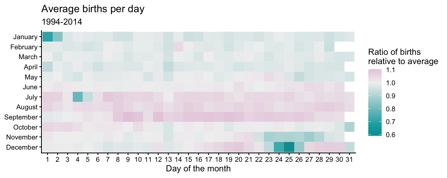 scale_fill_continuous_diverging(palette = "Purple-Brown", mid = 1)Major U.S. holidays with fixed dates tend to have fewer births relative to the average. Christmas Day has the fewest births (along with Christmas Eve and Boxing Day). New Year’s Day, Independence Day (July 4th), and Halloween (October 31st) also have substantially fewer births than average. Thanksgiving Day always falls between November 22 and 28 which have lower-than-average birth ratios. February 14th (Valentine’s Day) has a slightly higher ratio than the surrounding days, but the difference is not very large. Since it is a holiday associated with love, some individuals may attempt induce labor on this date.