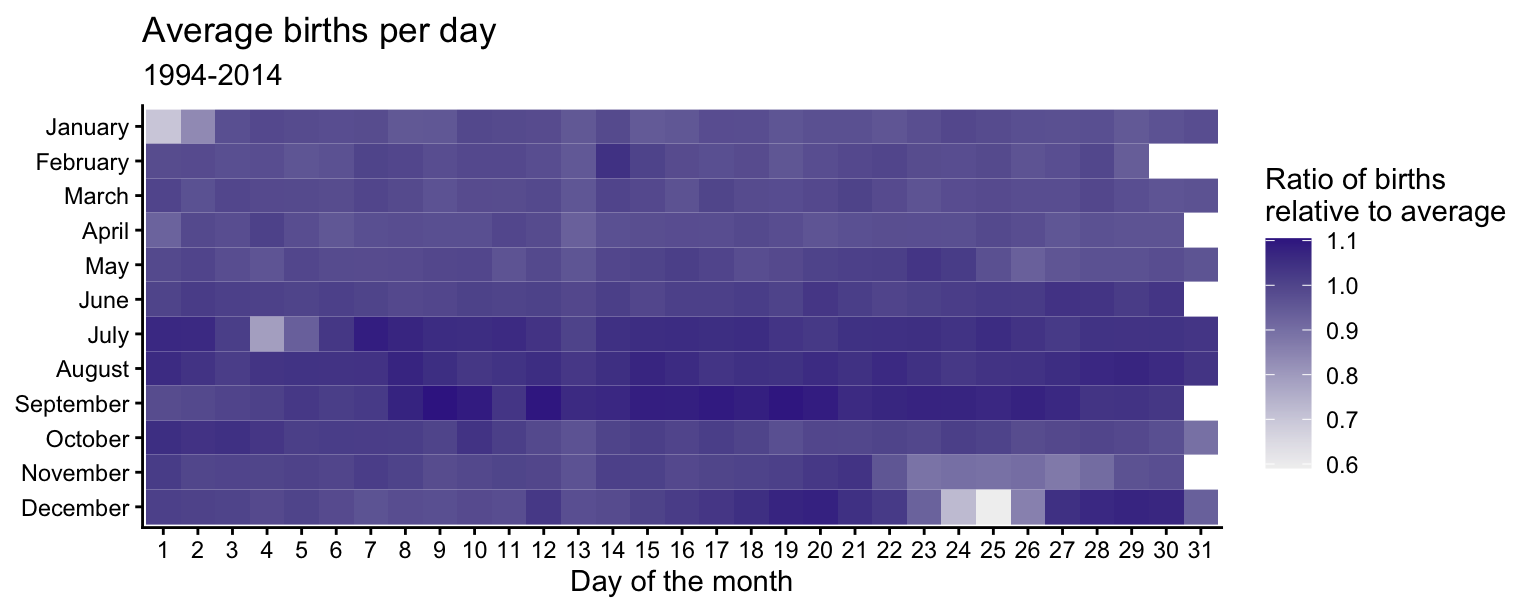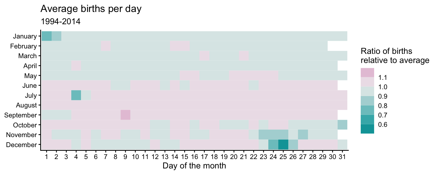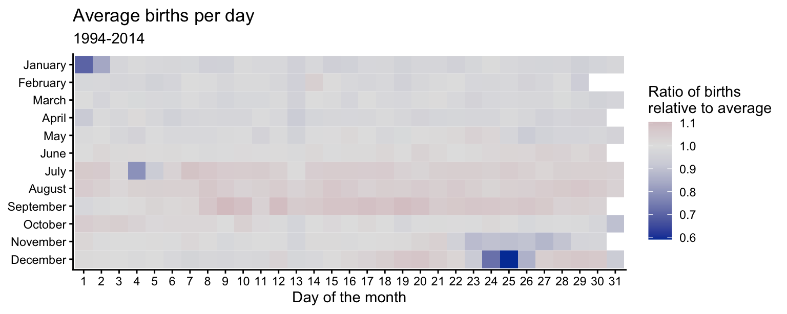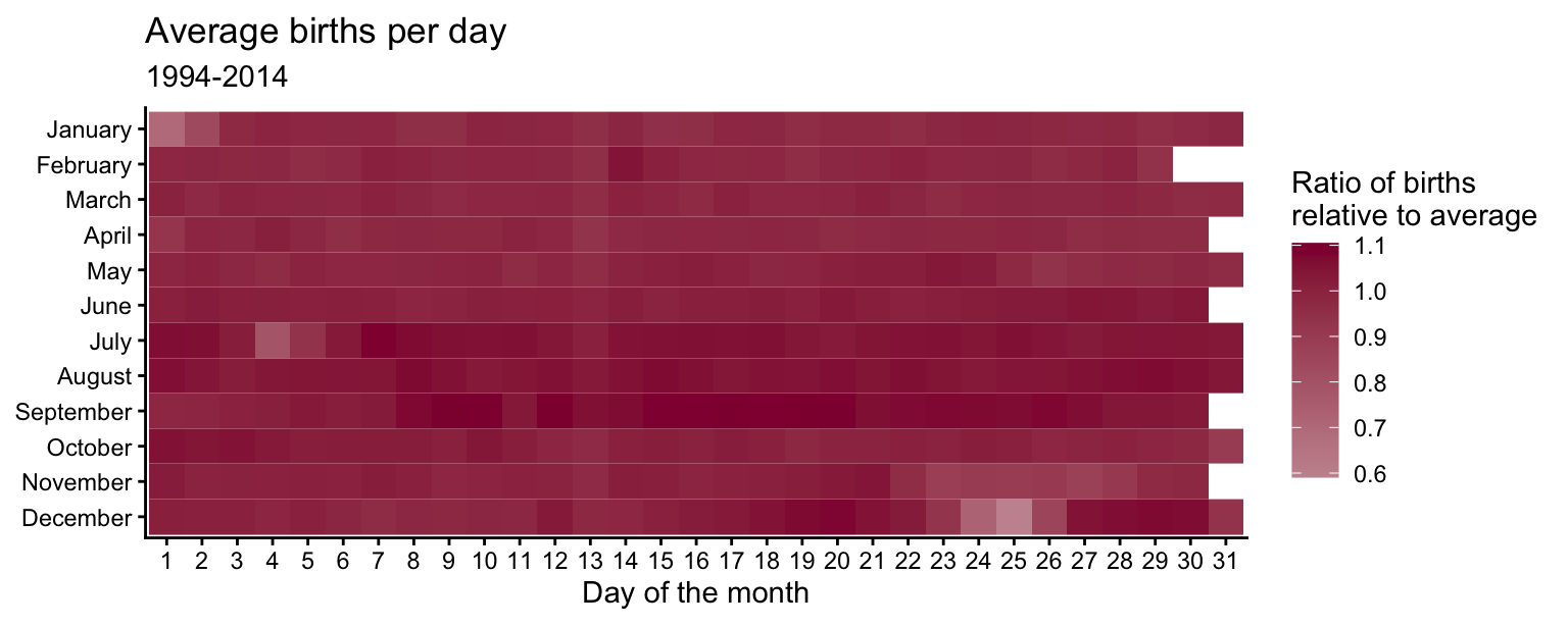 scale_fill_continuous_diverging(palette = "Purple-Brown", mid = 1)Major U.S. holidays with fixed dates tend to have fewer births relative to the average. Christmas Day has the fewest births (along with Christmas Eve and Boxing Day). New Year’s Day, Independence Day (July 4th), and Halloween (October 31st) also have substantially fewer births than average. Thanksgiving Day always falls between November 22 and 28 which have lower-than-average birth ratios. February 14th (Valentine’s Day) has a slightly higher ratio than the surrounding days, but the difference is not very large. Since it is a holiday associated with love, some individuals may attempt induce labor on this date.