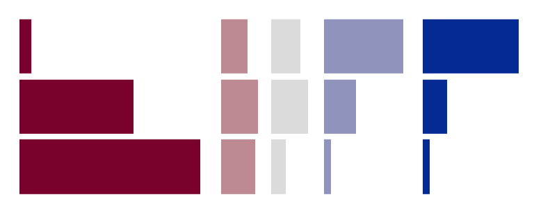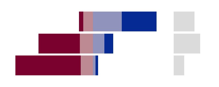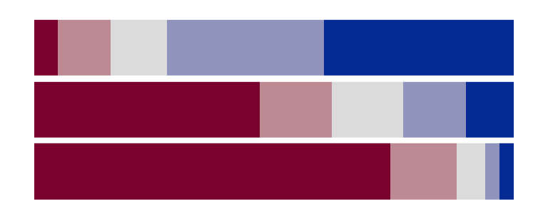 - Split bars: each response category is plotted in a separate facet, with negative responses on the left and positive responses on the right. Neutral responses are plotted in their own facet in the middle.