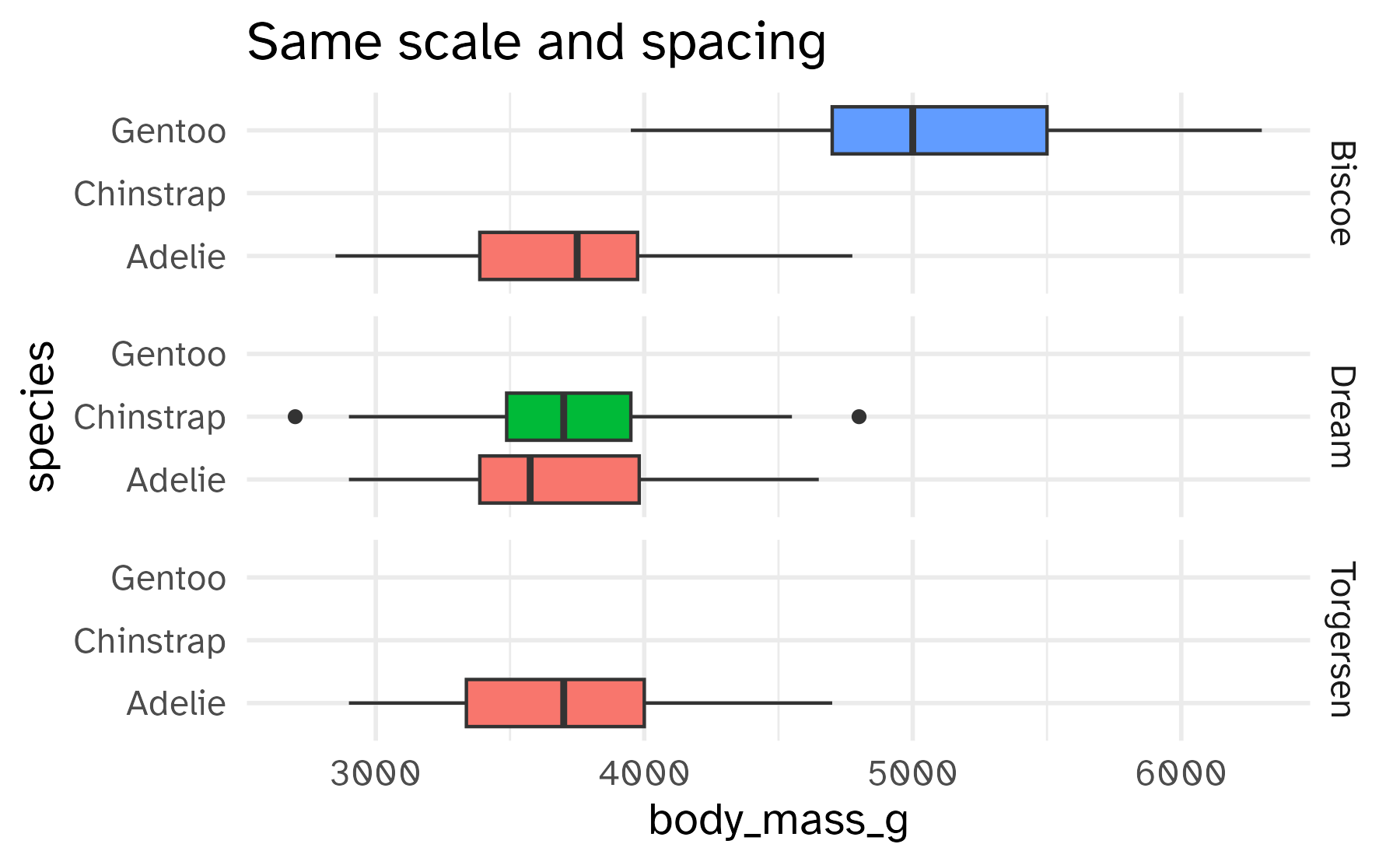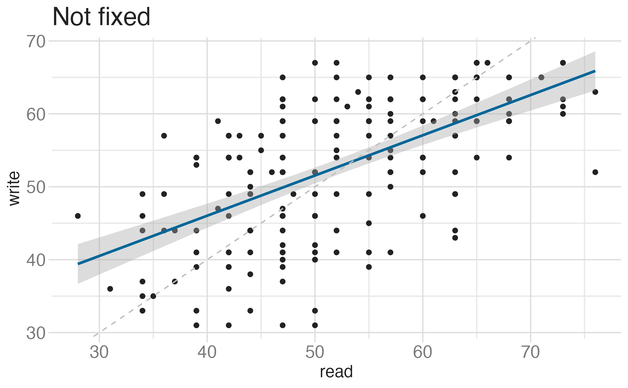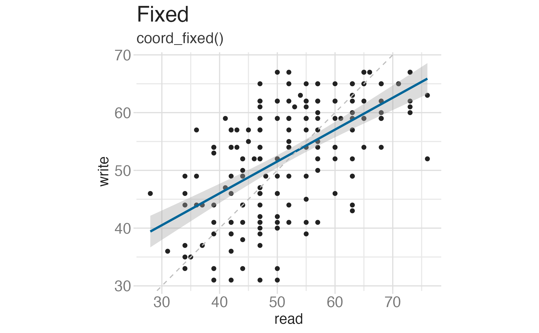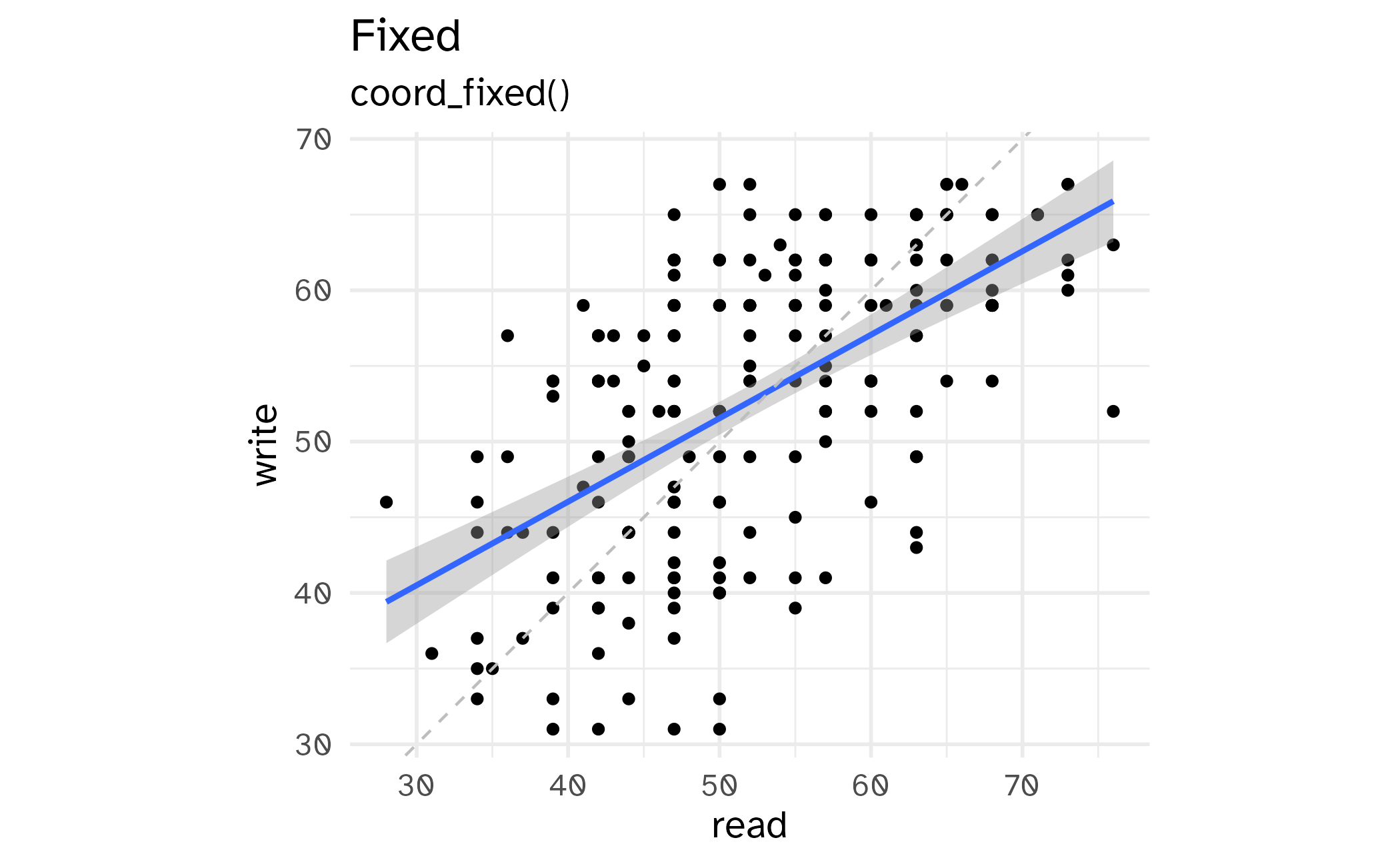 coord_fixed()Useful when having an aspect ratio of 1 makes sense, e.g. scores on two tests (reading and writing) on the same scale (0 to 100 points)
