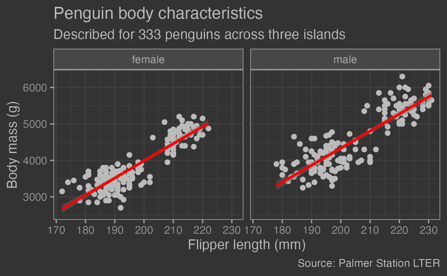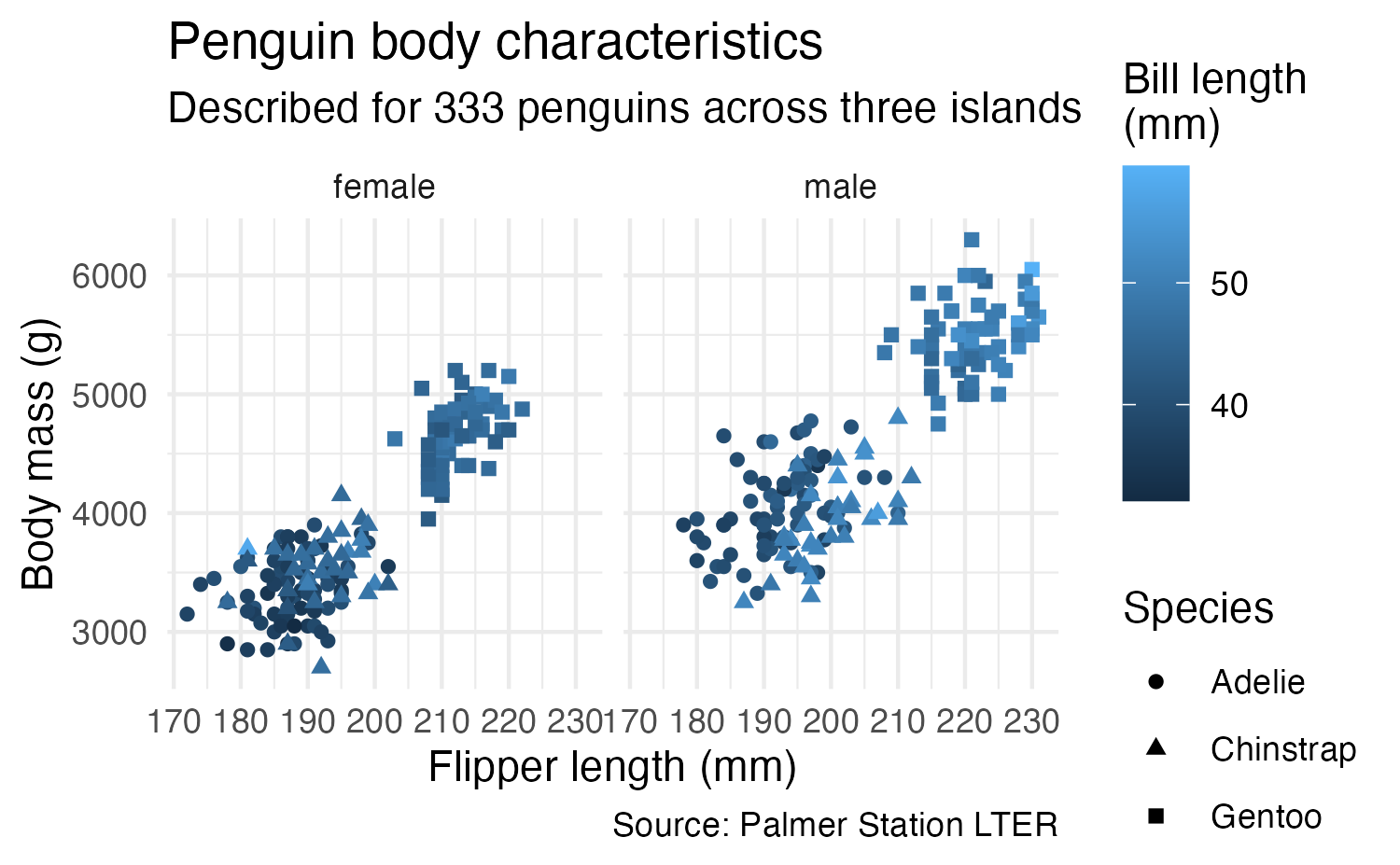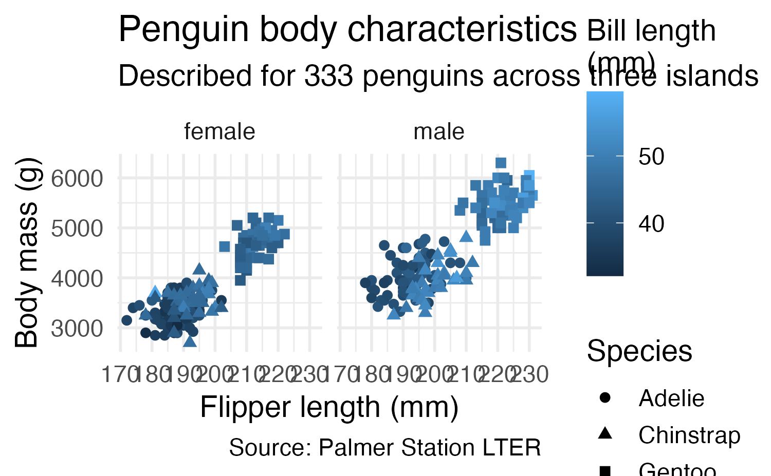 x = "Bill length (mm)", y = "Body mass (g)", color = "Sex",