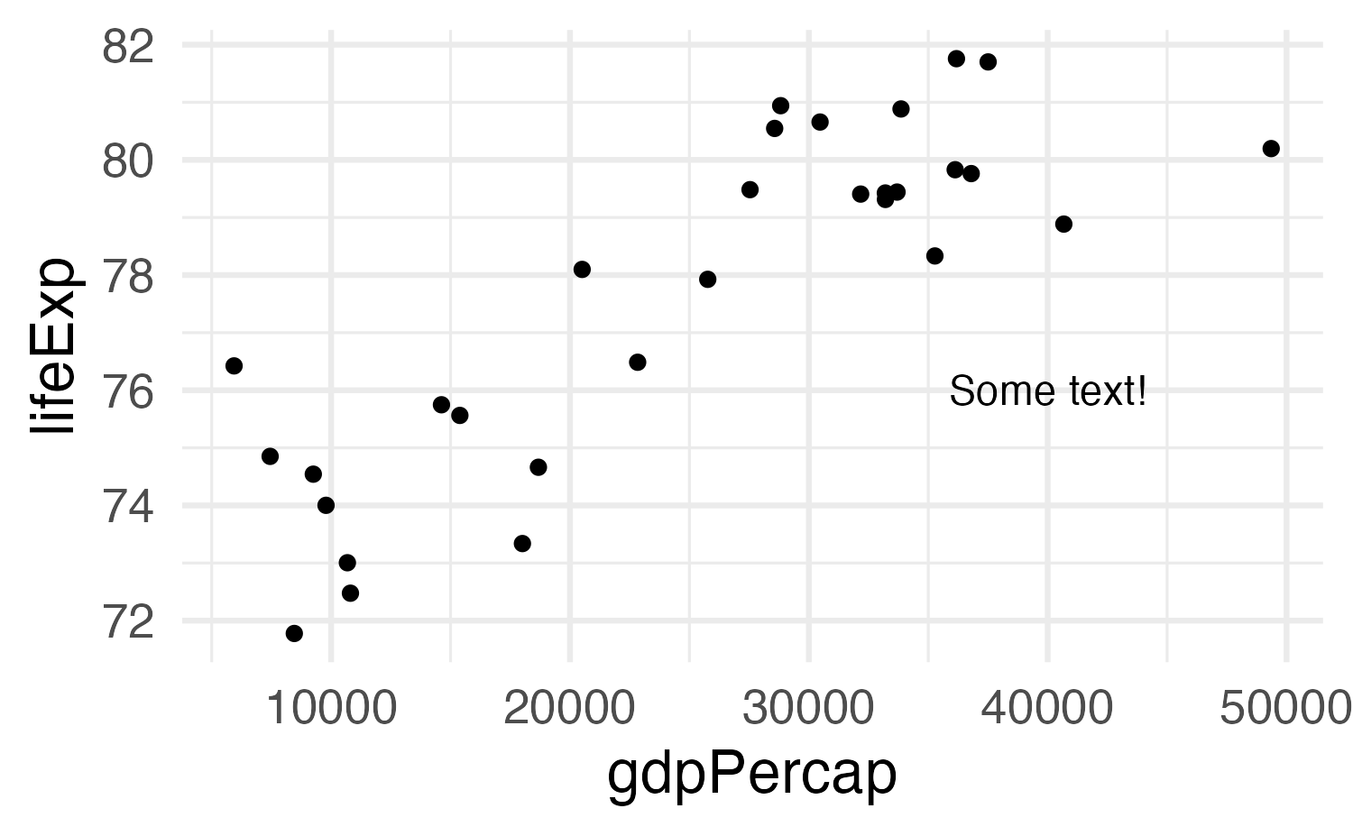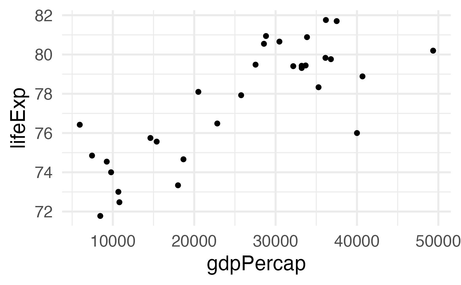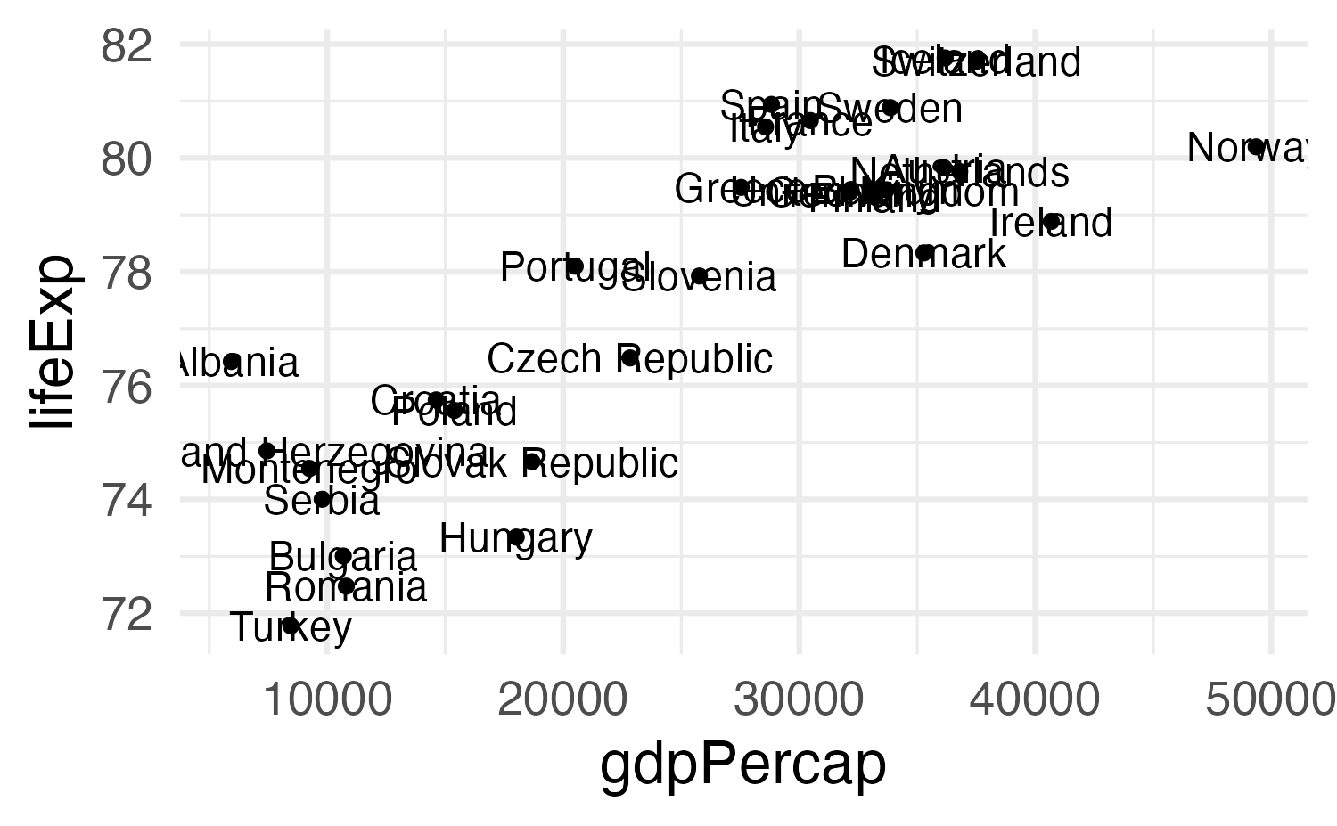 aes(x = gdpPercap, y = lifeExp)