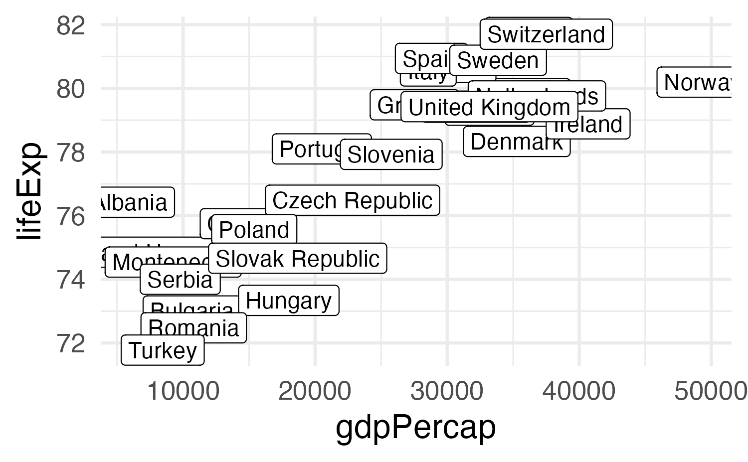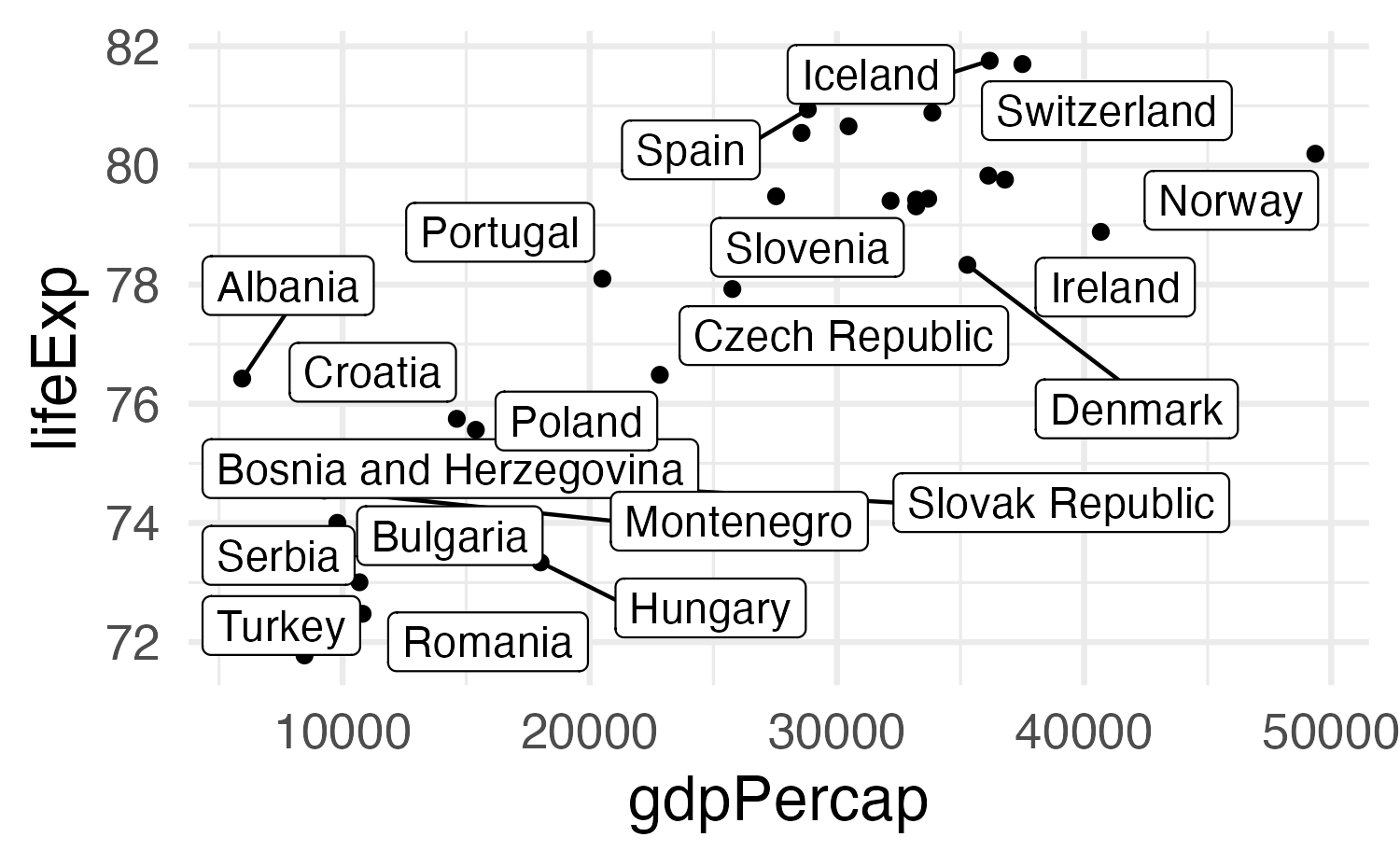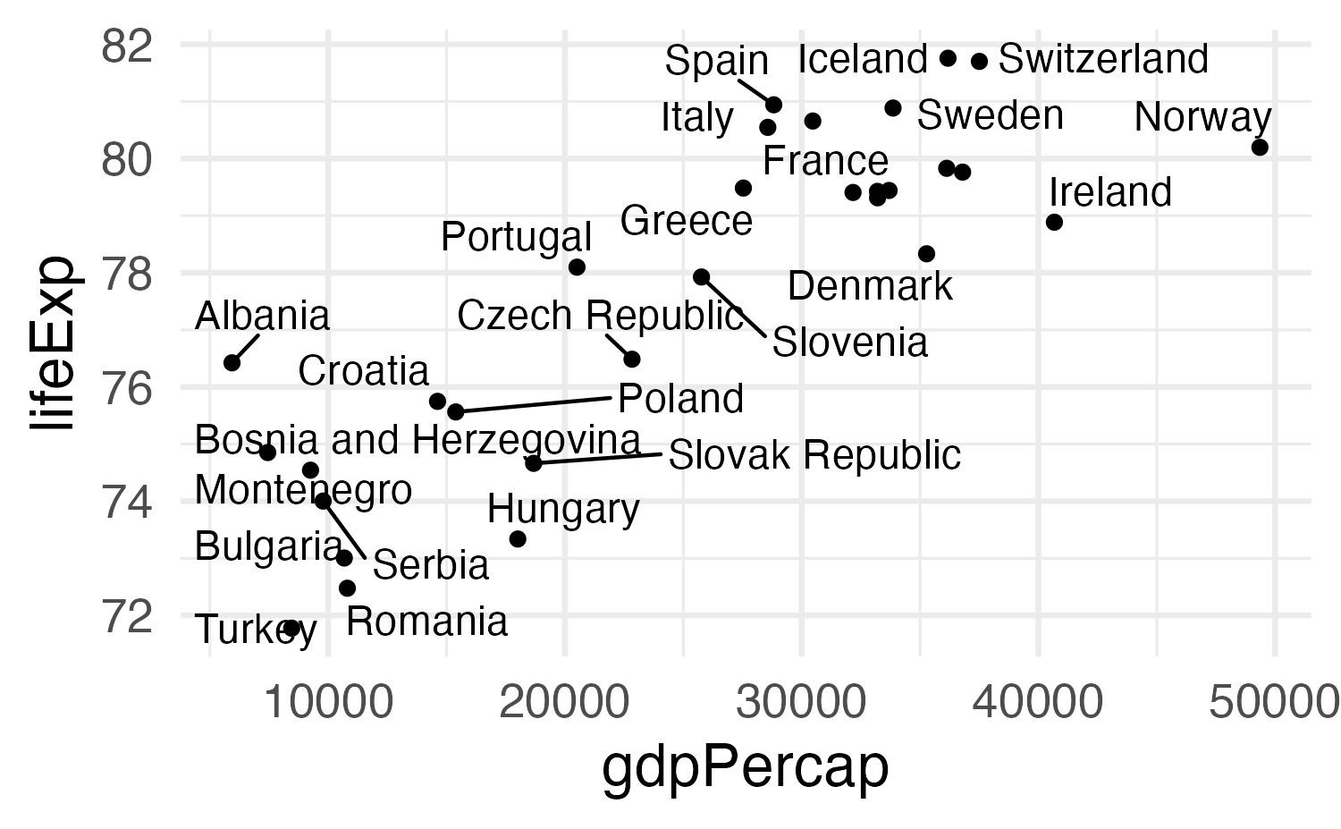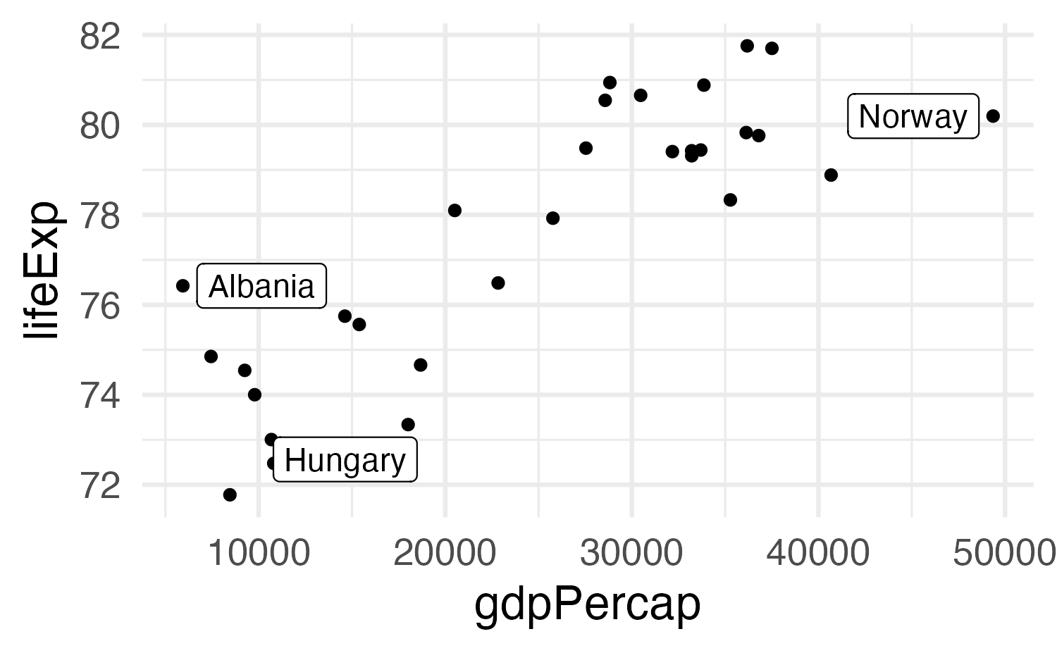 aes(x = gdpPercap, y = lifeExp)