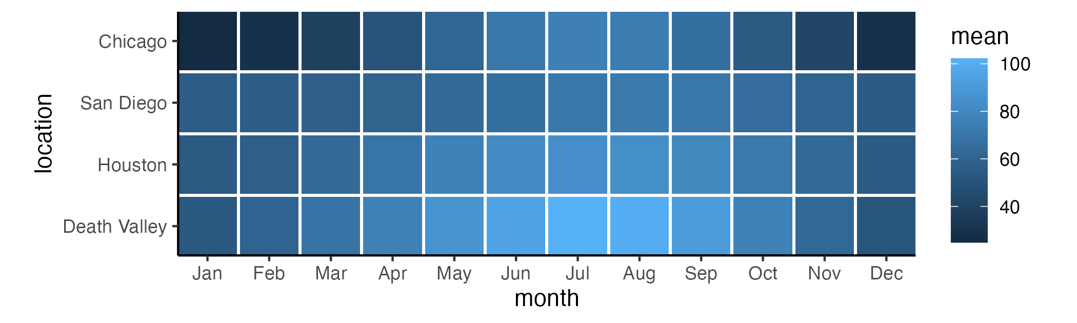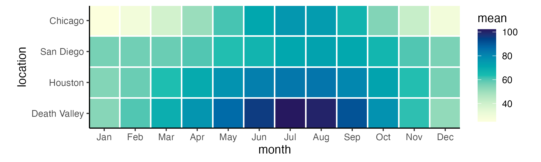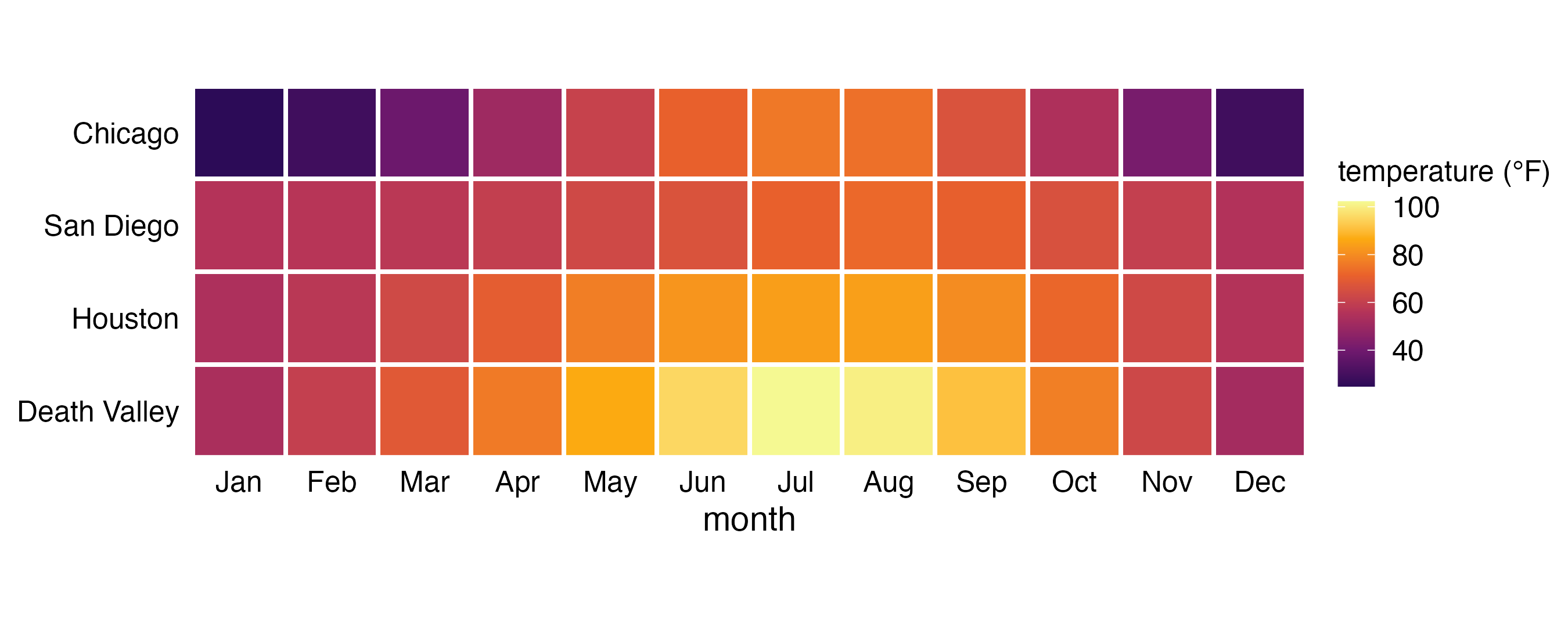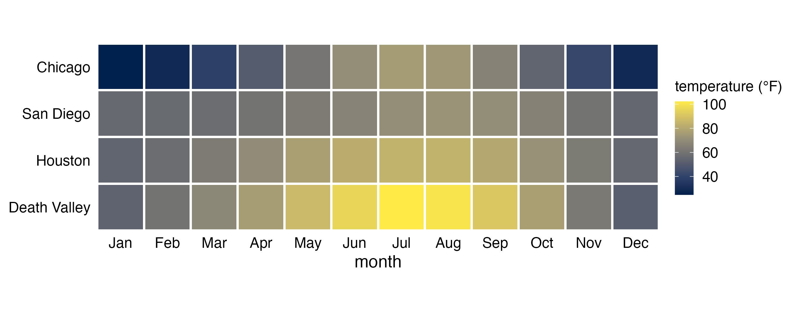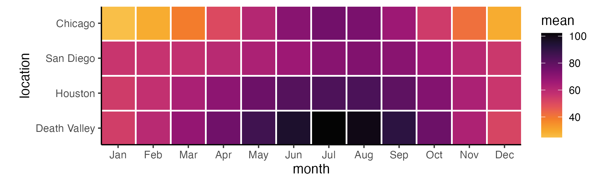 | scale_fill_viridis_c() | color | continuous | sequential |