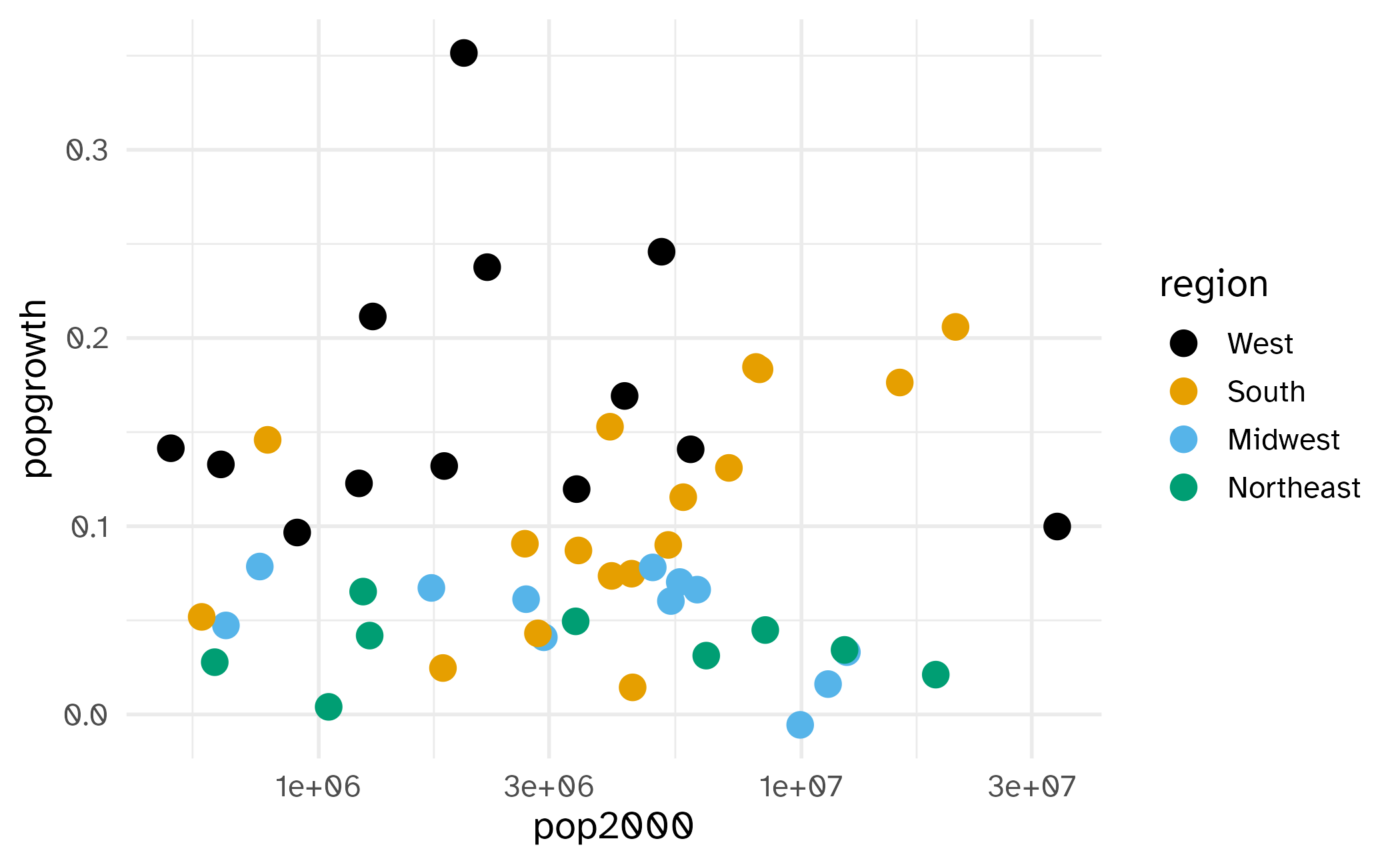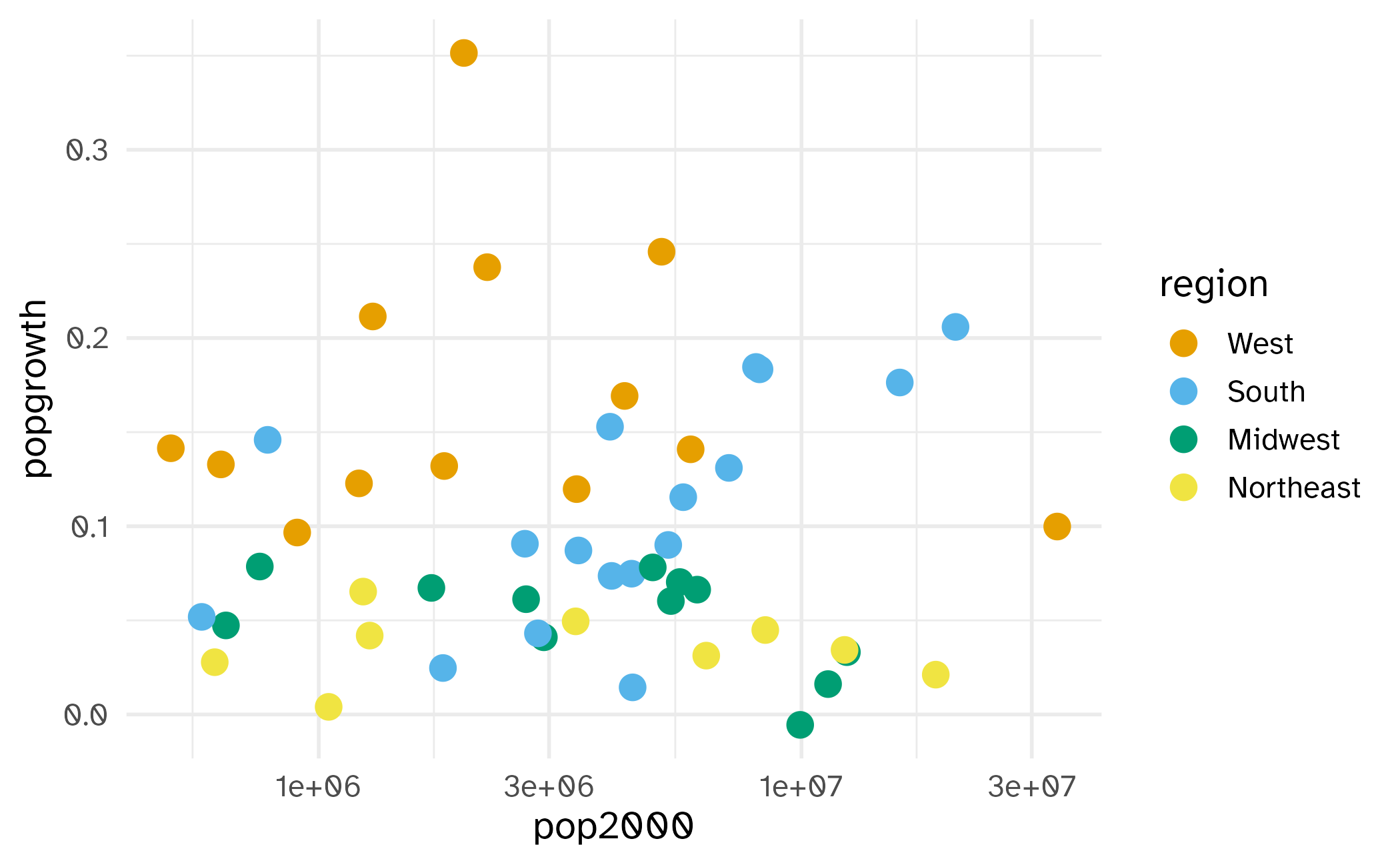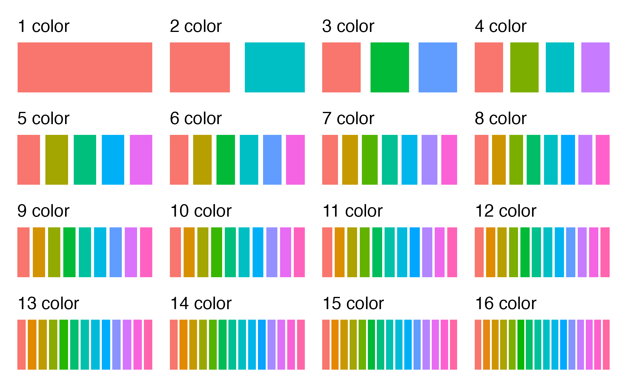 <aesthetic>: name of the aesthetic (fill, color)<datatype>: type of variable plotted (discrete, continuous, binned)<colorscale>: type of the color scale (qualitative, sequential, diverging, divergingx)| Scale function | Aesthetic | Data type | Palette type |