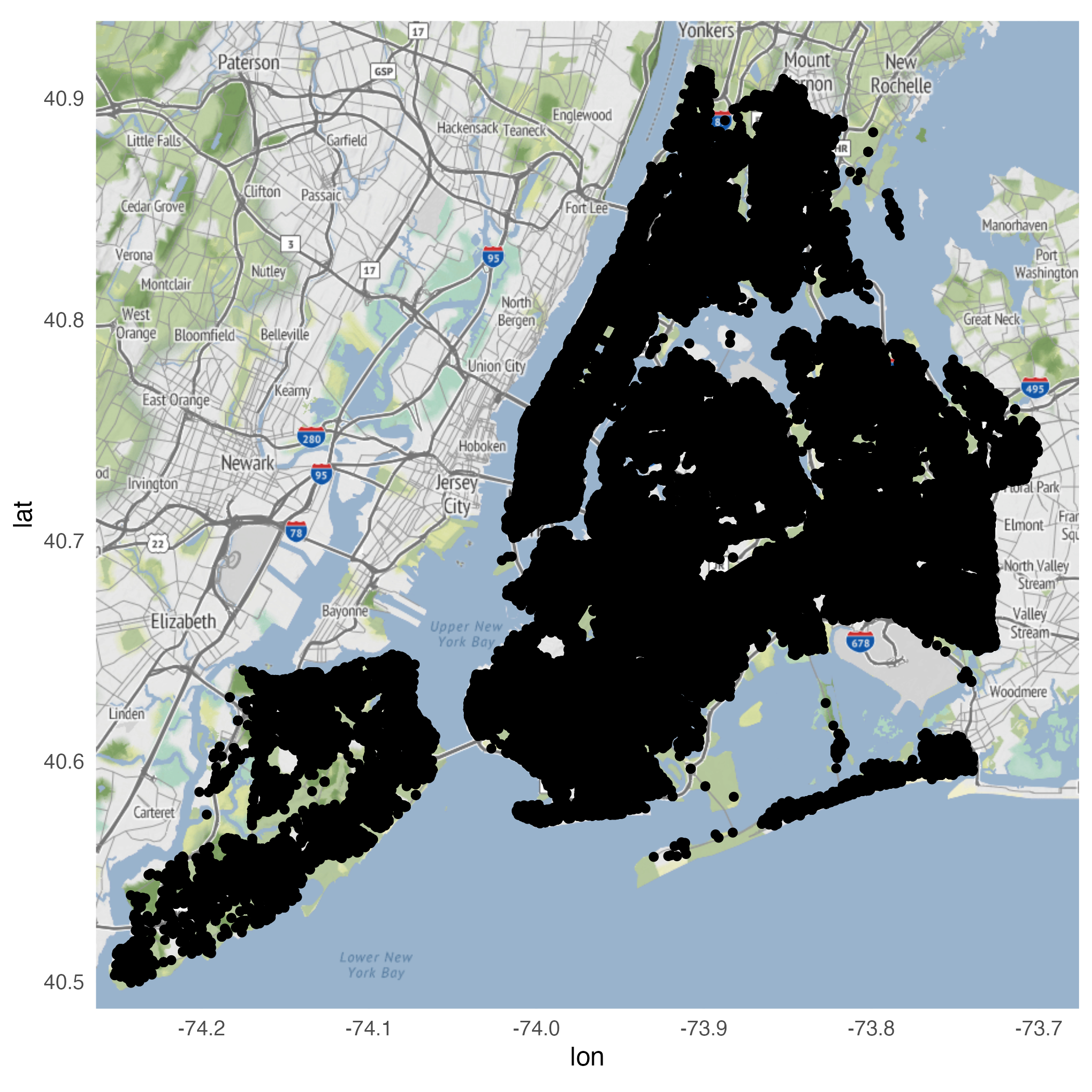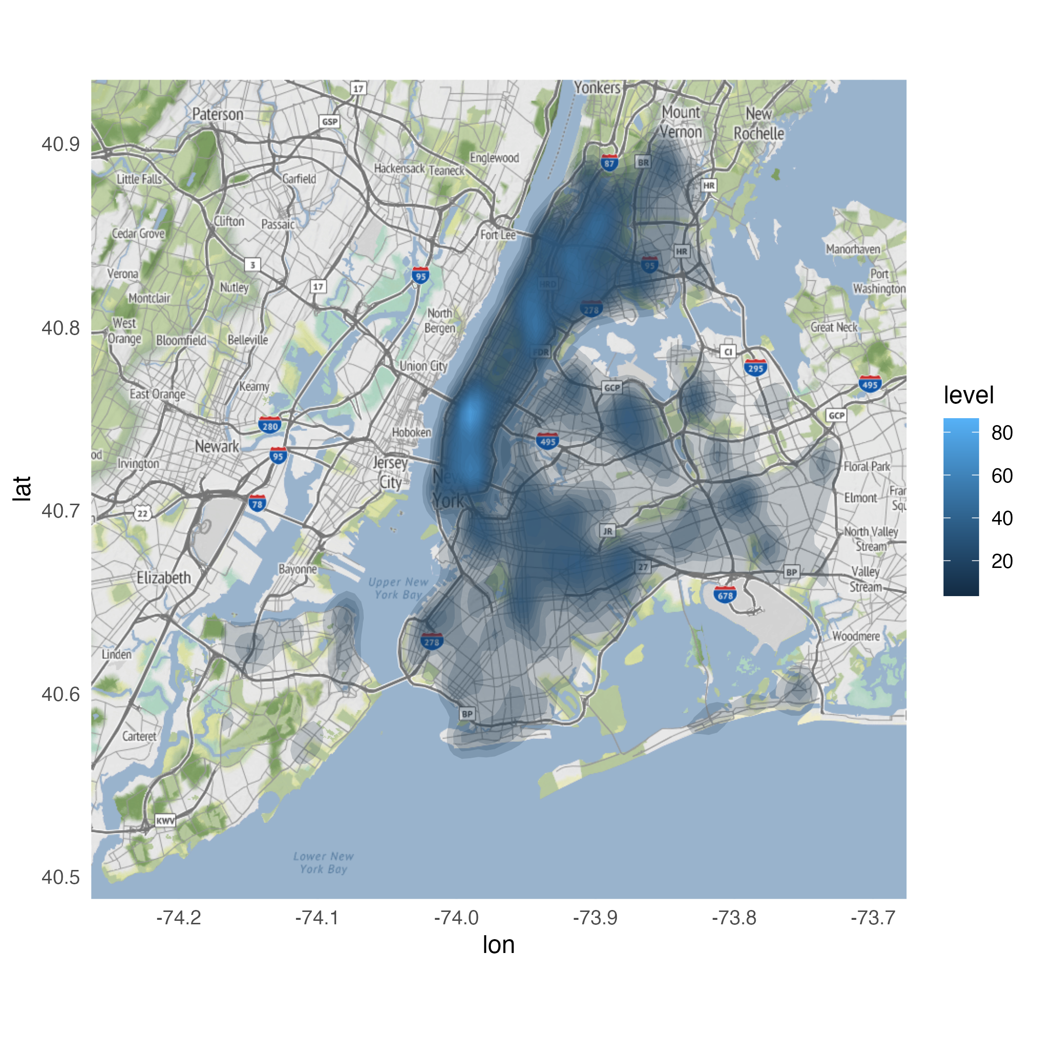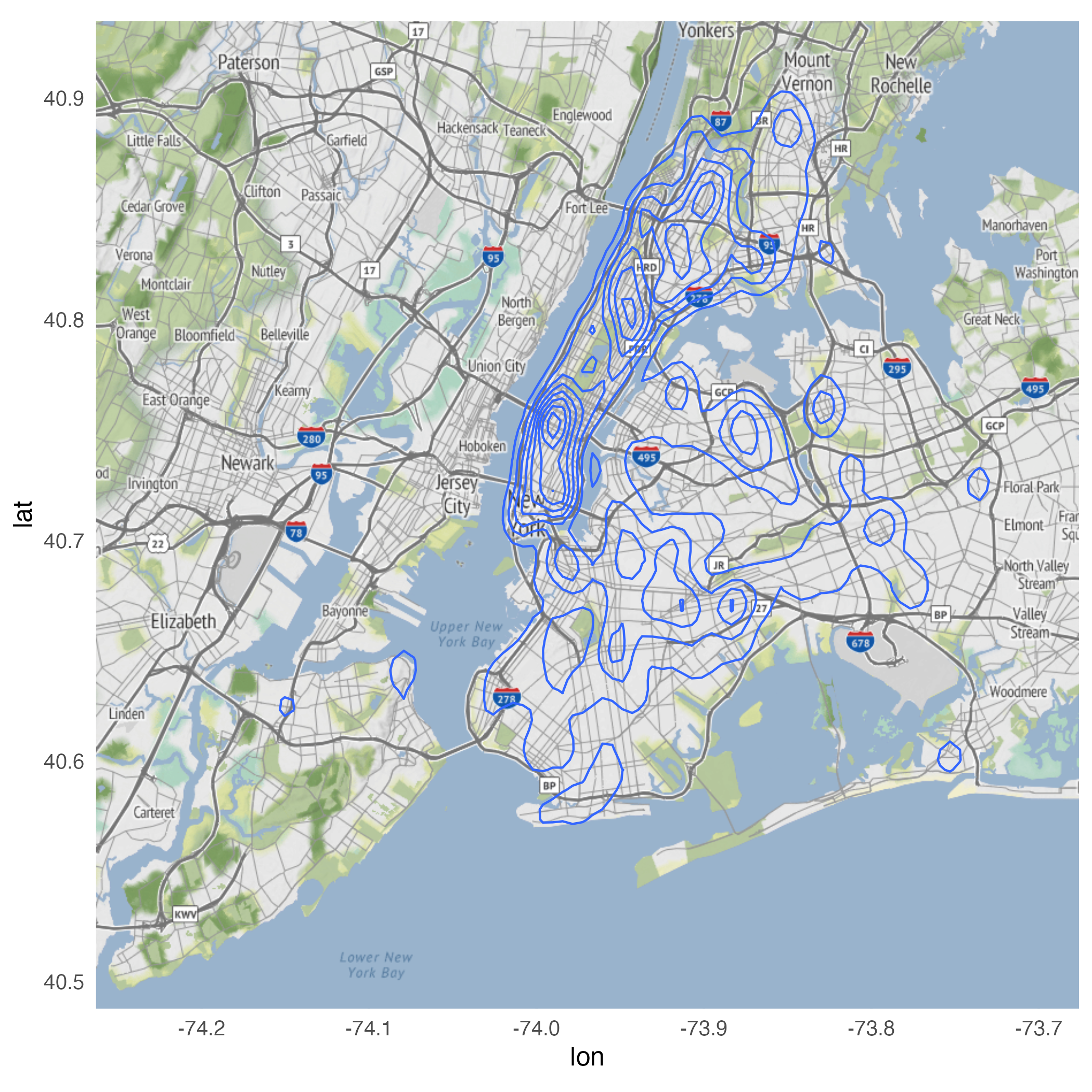 geom_point()geom_point()geom_density_2d()stat_density_2d()stat_density_2d()ggmap(nyc) +