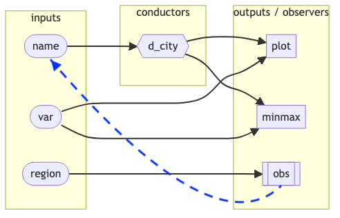 shinyApp(ui = ui, server = server)This is an example of a reactive conductor - it is a new type of reactive expression that exists between sources (e.g. an input) and endpoints (e.g. an output).