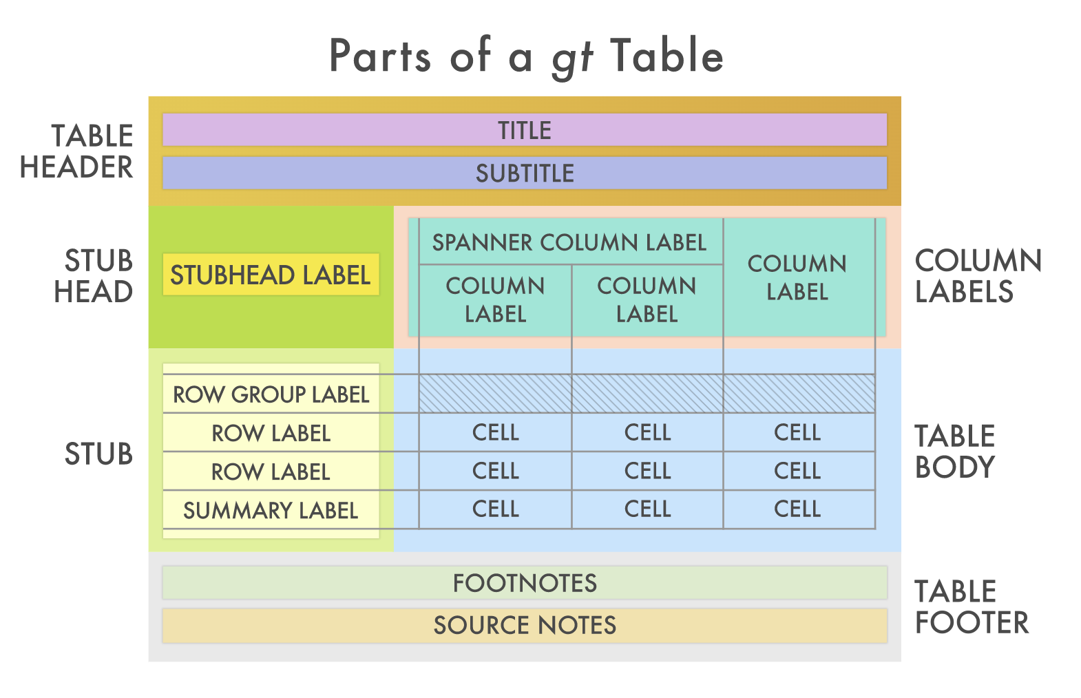 The gt philosophy: we can construct a wide variety of useful tables with a cohesive set of table parts.